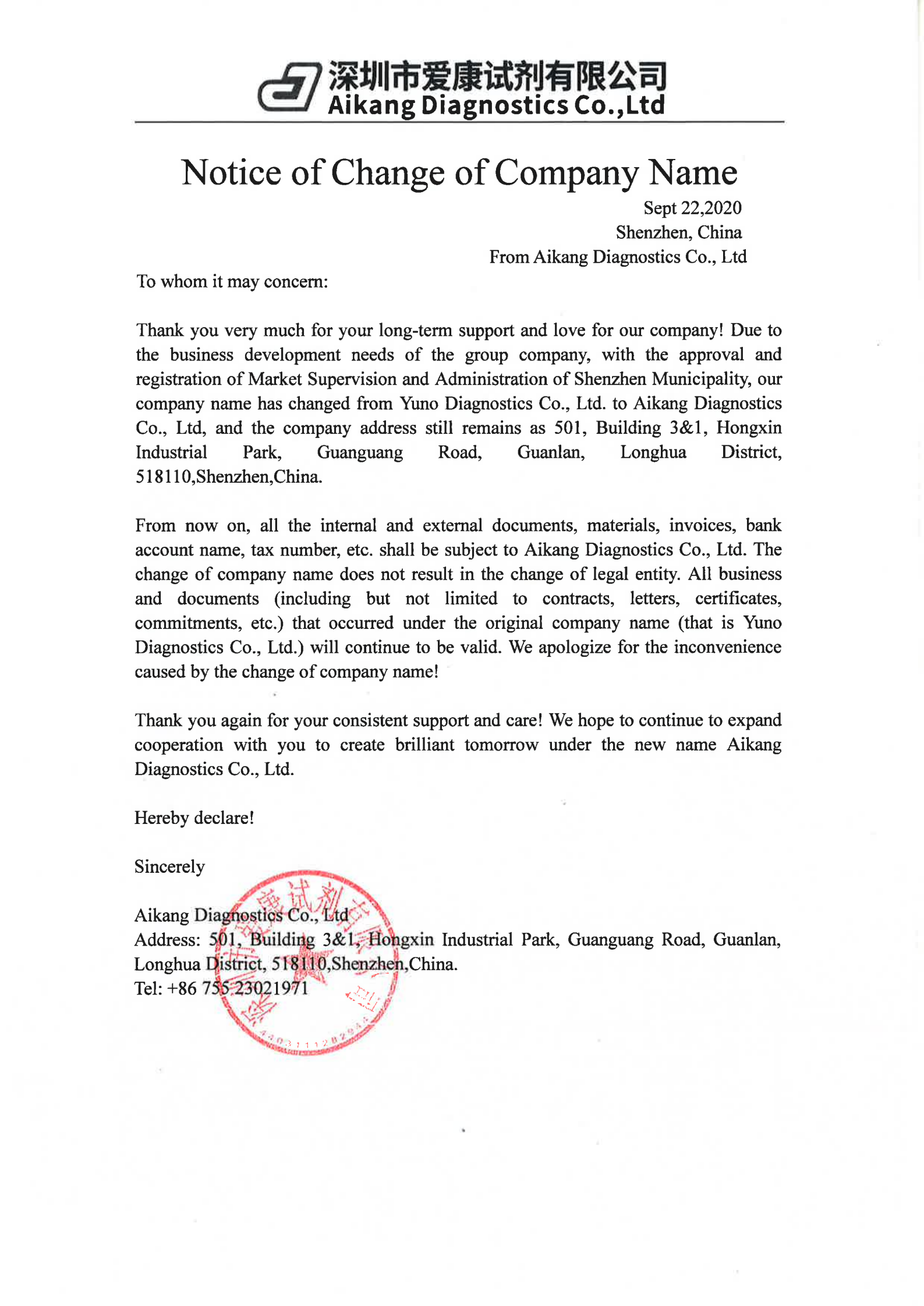 Notice of Change of Company Name