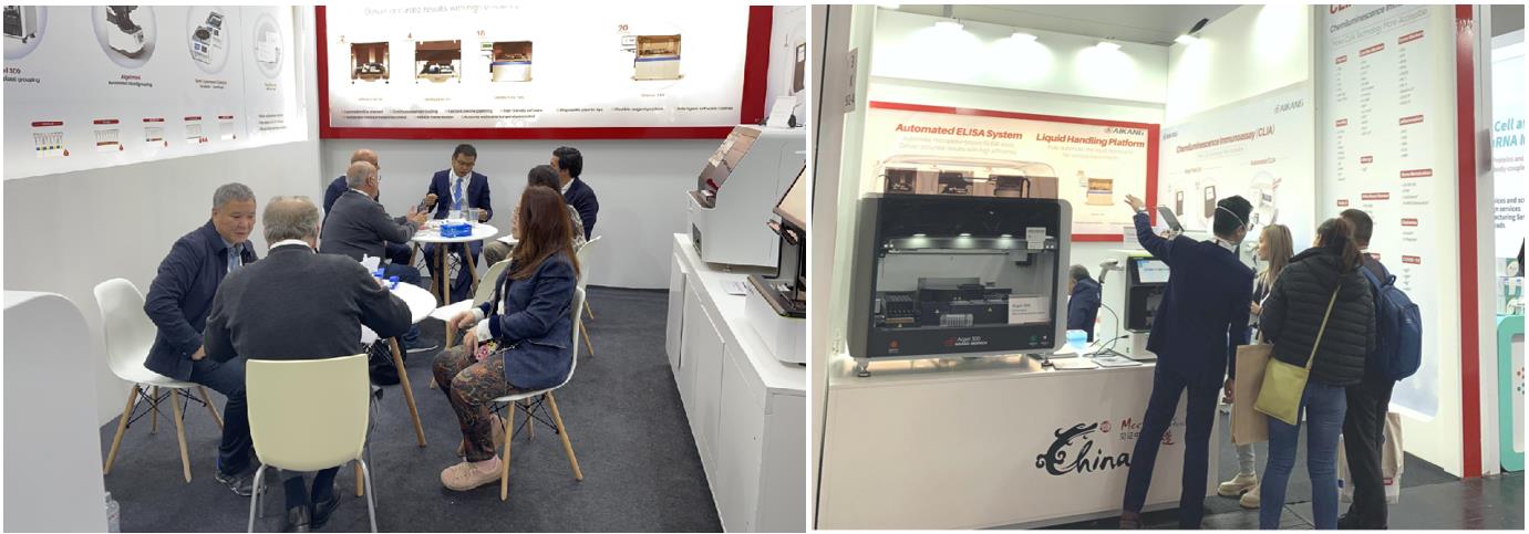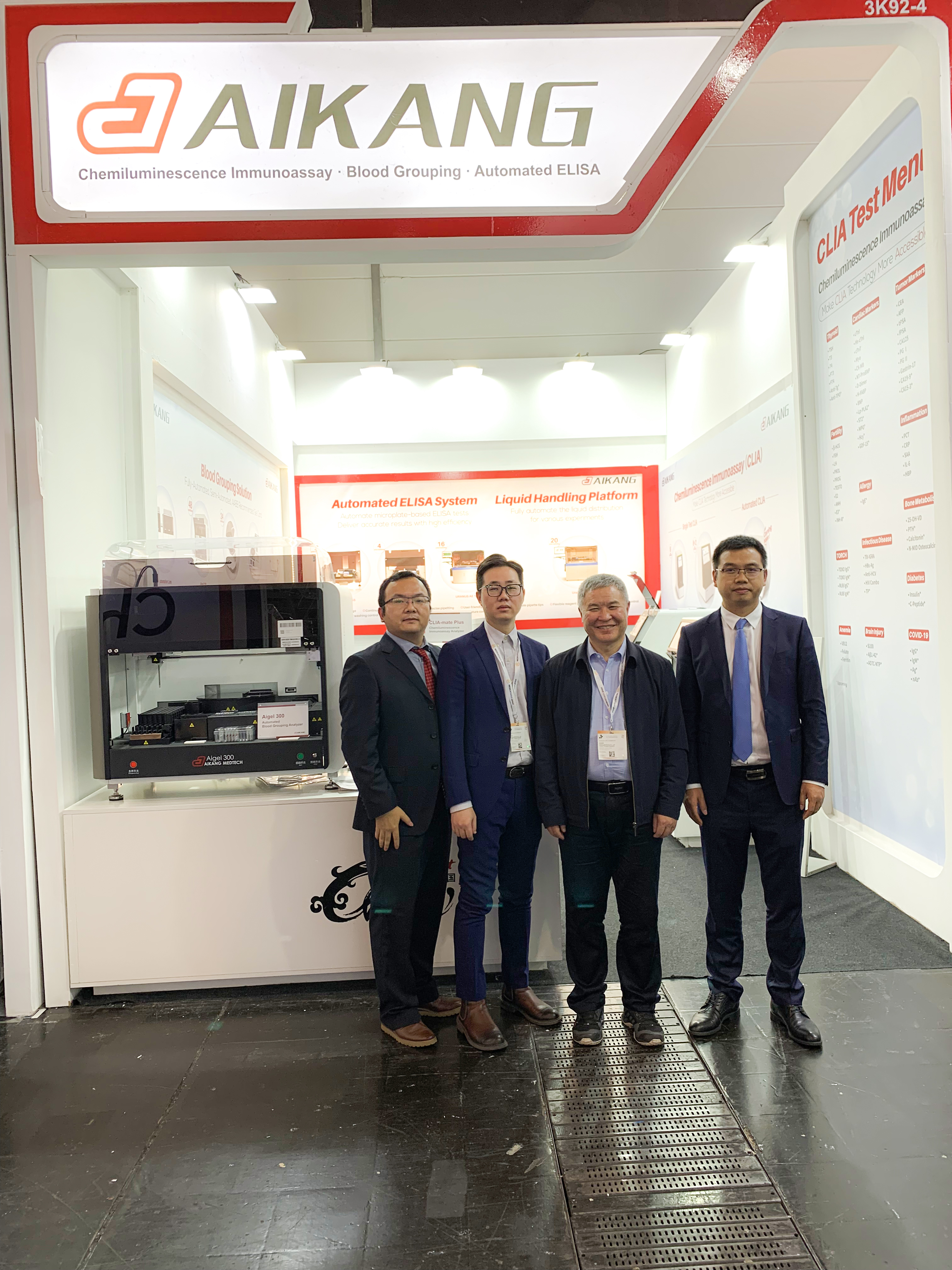 Aikang cherished every chance of communicating with international partners face-to-face. This time, Chairman Zhang of Aikang group led the international marketing colleagues as the expo team to meet our international customers at the Rhine River. In the exhibition, not only the new-released Chemiluminescence Immunoassay analyzer CLIA-mate 1200, but also the star products CLIA-mate Plus and C 900 which were in the same series showcased, and the Automated Blood Grouping analyzer Aigel 300 was exhibited, too.