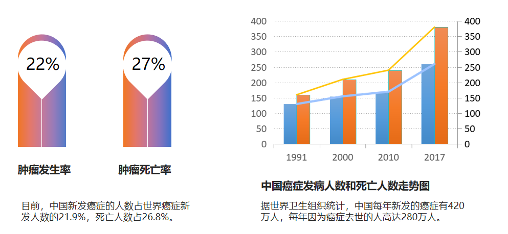 2020年中国新发癌症病例457万例,癌症死亡病例300万例。新发癌症人数、癌症死亡人数均位居全球第一。《健康中国2030规划纲要》中提出总体癌症5年生存率提高15%的目标。