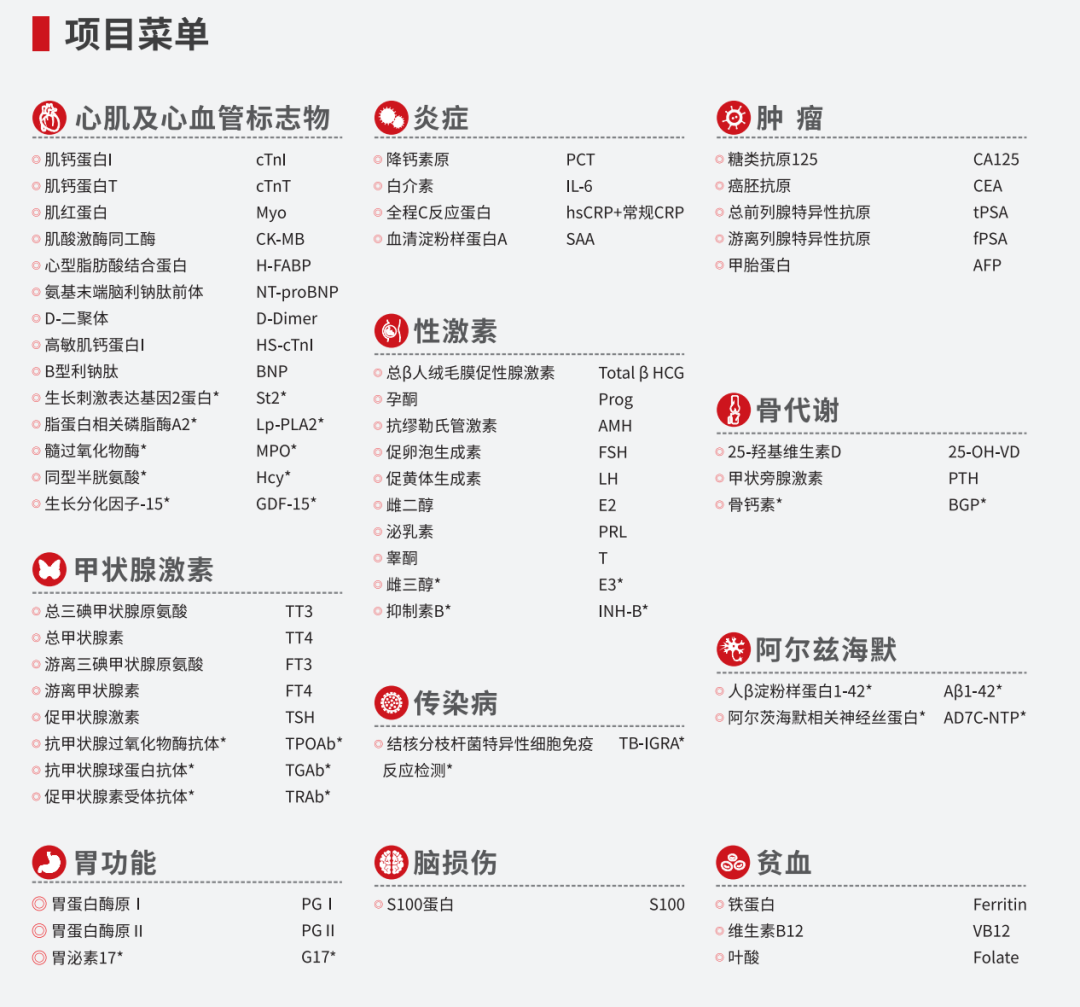 除此之外,患有心脑血管疾病、慢阻肺、糖尿病、慢性肾病、肿瘤、免疫功能缺陷等疾病的老年人,在监测心脏功能、心肌损伤/心梗、血管栓塞、炎症等指标同时,可能还需要进行肿瘤、甲功、贫血、骨代谢等其他疾病的诊断。针对不同的应用场景,深圳华体平台可以提供全面的检测菜单,满足不同的需要。