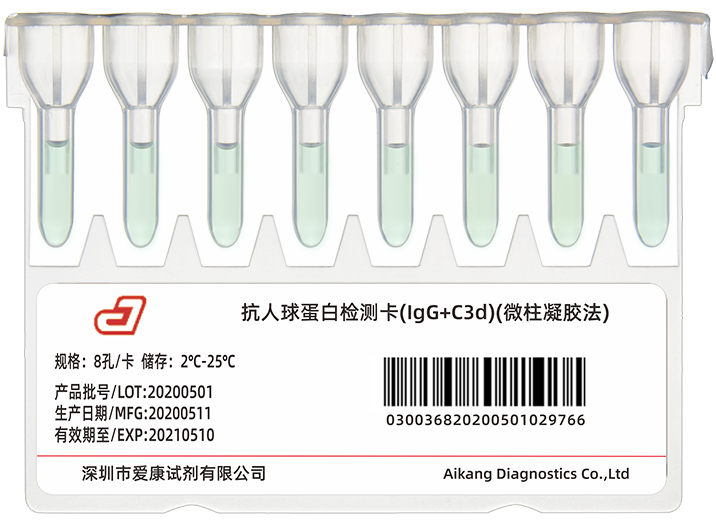 采用微柱凝胶法,8孔卡设计,用于直接抗人球蛋白试验和间接抗人球蛋白试验